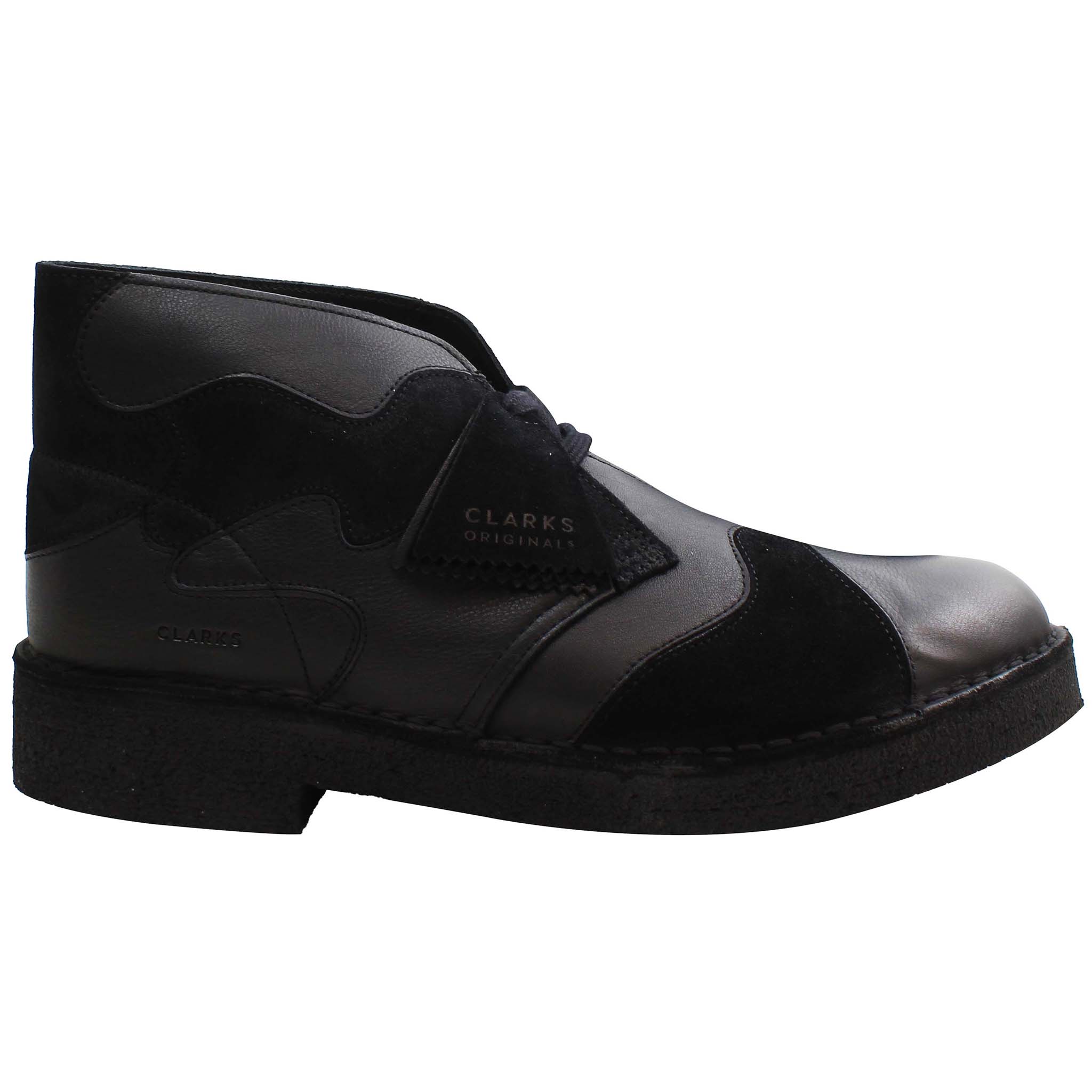 The Clarks Desert Patch Men's Black Boots feature a sleek black upper made from premium leather or suede, enhanced with distinctive patchwork detailing that sets them apart from the traditional desert boot style. The boots maintain the classic two-eyelet lace-up design and are equipped with a soft, cushioned footbed for superior comfort. The durable crepe sole, a hallmark of Clarks, provides excellent grip and shock absorption, making these boots perfect for all-day wear. Their minimalistic yet stylish design makes them a versatile addition to any wardrobe, suitable for both casual and smart-casual outfits.