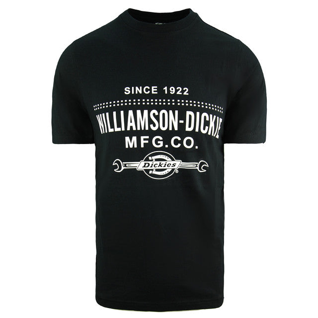 This short sleeve t-shirt with a crew neck is part of a range of printed t-shirts for men. The Dickies Castleton is a black cotton t-shirt with a large Dickies logo on the chest. This print is also available on our new blue Teal model for summer 2019.