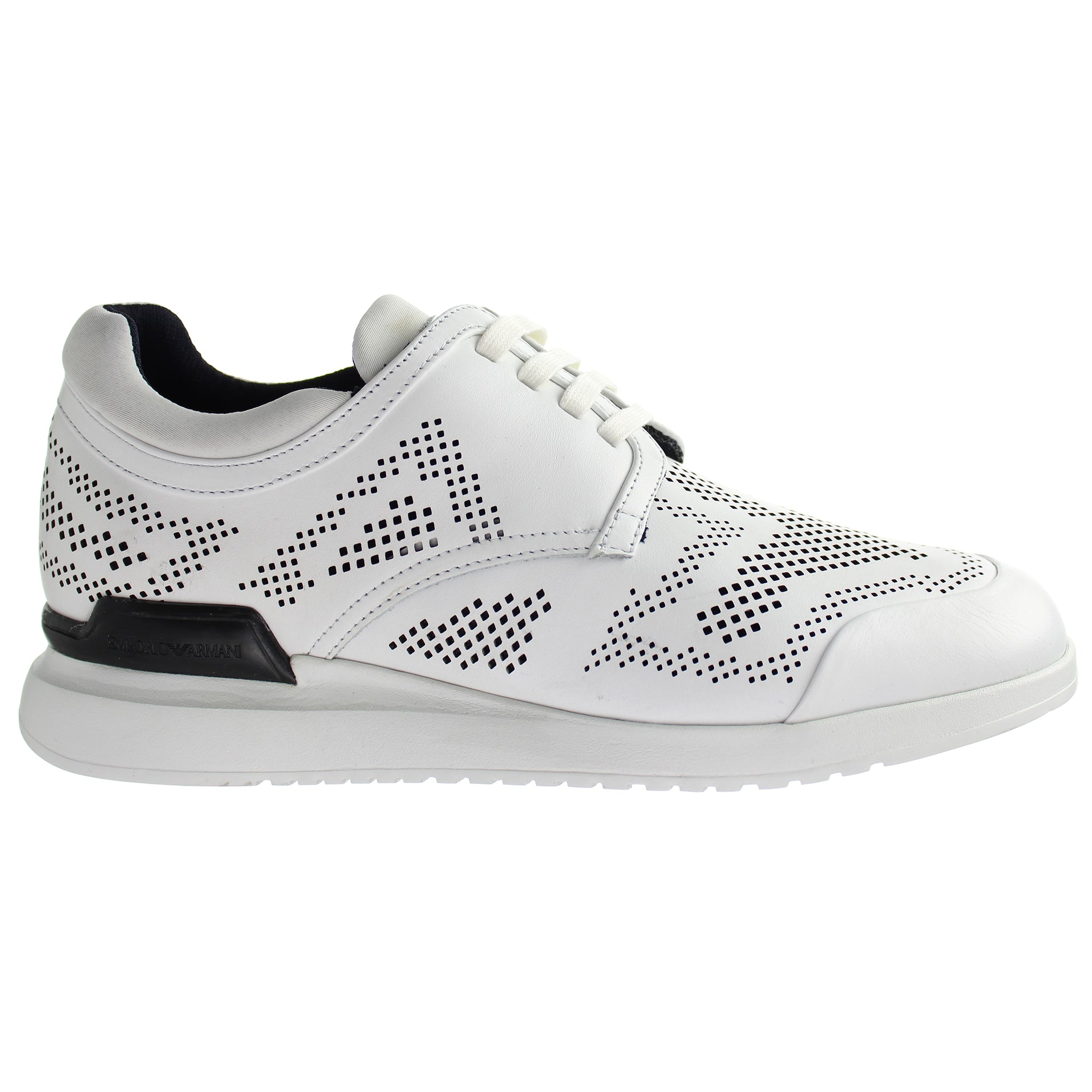 These Emporio Armani Men's White Trainers offer a sleek, modern design with a sporty aesthetic, making them a versatile choice for any wardrobe. The upper is crafted from smooth white leather, adorned with intricate perforated detailing that creates a dynamic geometric pattern, adding texture and style. The black leather accents at the heel and side panels bring a refined contrast to the clean white design.