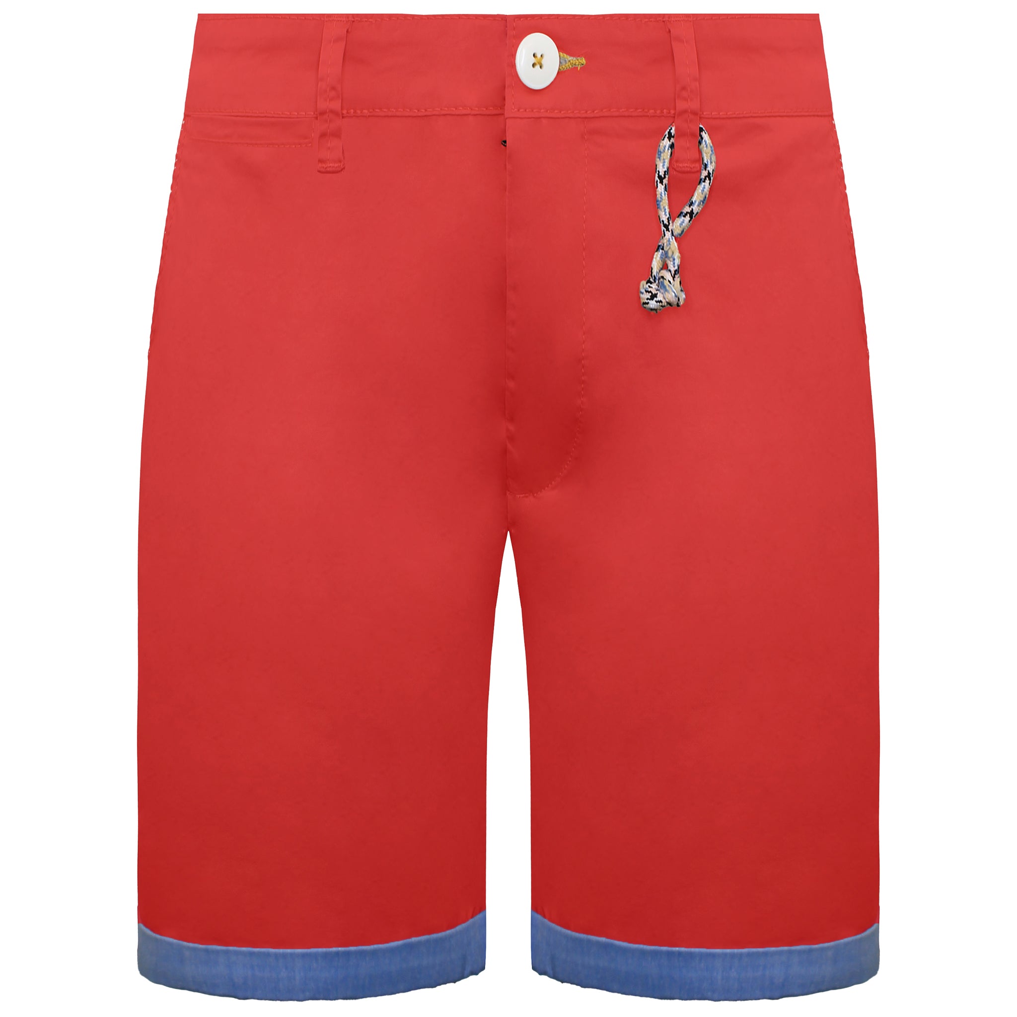 Designed with practicality in mind, these shorts feature a button and drawstring closure, providing an adjustable fit for added comfort. The stylish cuffed hem showcases a contrasting blue fabric underneath, adding a unique detail that enhances their overall appeal. With side pockets for convenient storage, they combine functionality with fashion seamlessly.