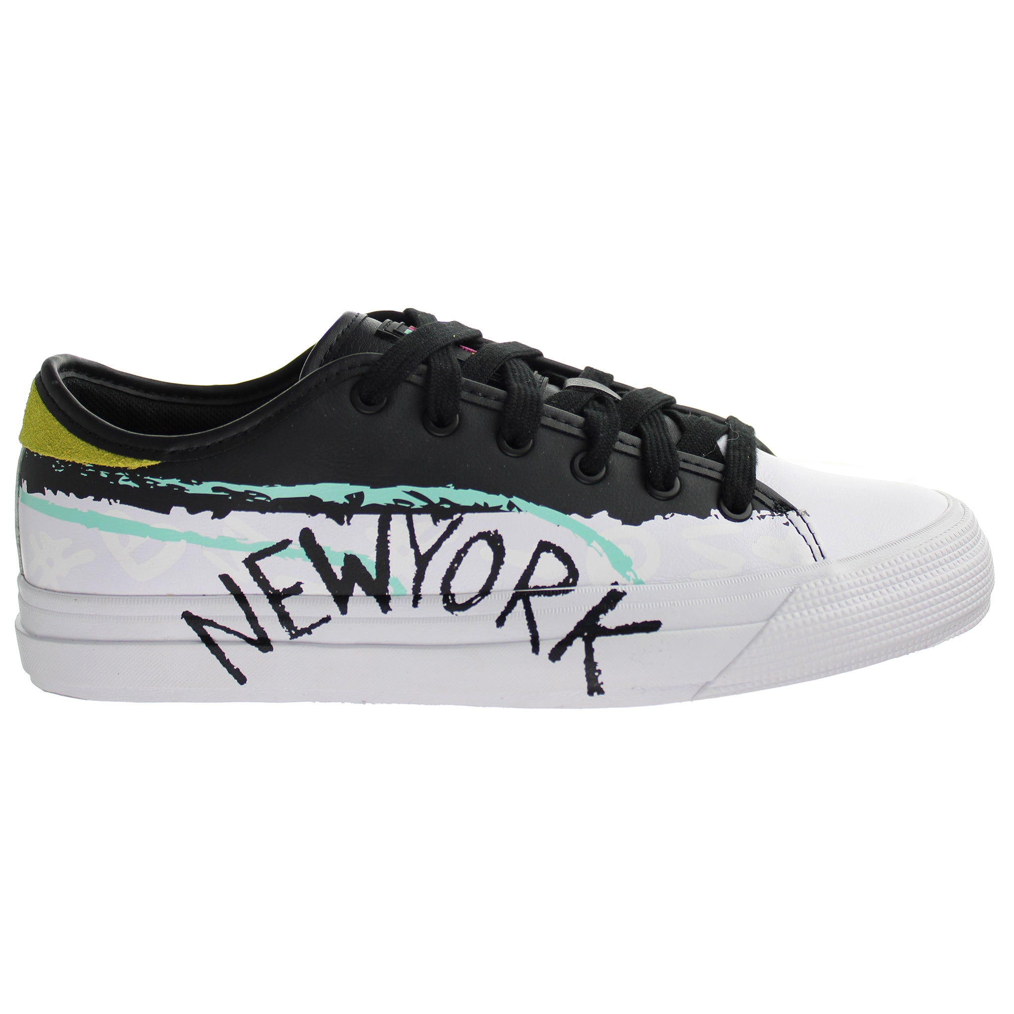 The Puma Capri Bradley Theodore Men's Black/White Trainers offer a bold and modern design, perfect for those who want to make a statement. Featuring a sleek black upper with a striking white base, these sneakers are adorned with colorful, abstract "NEW YORK" graphic detailing, giving them an urban, streetwear vibe. The shoes combine a classic silhouette with an edgy touch, highlighted by the vibrant mint green and yellow accents. The durable rubber sole ensures comfort and grip, making them an ideal choice for both casual and active wear. These trainers capture the essence of contemporary fashion with an artistic flair, perfect for making a trendy statement