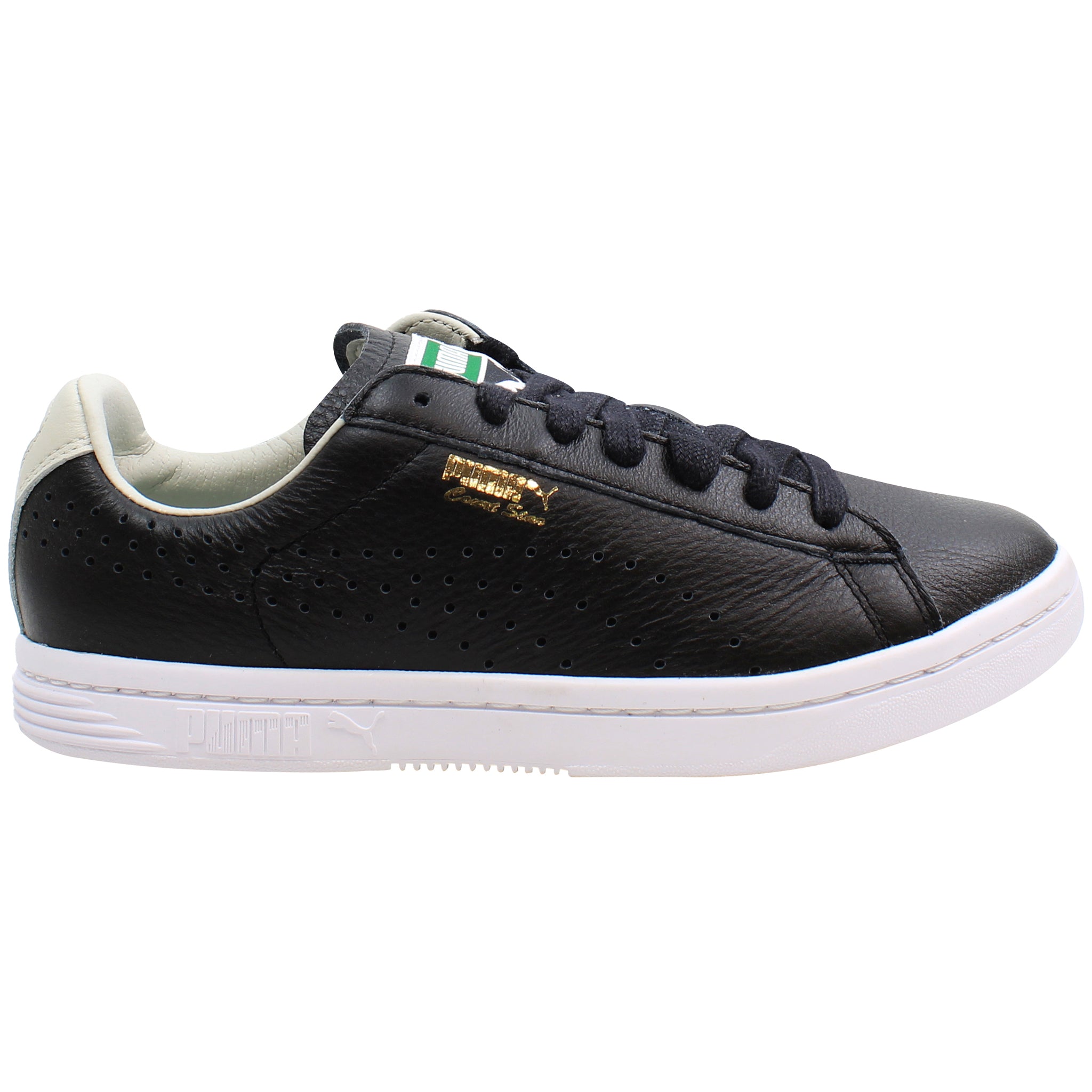 The Puma Court Star NM Men's Black Trainers combine classic style with modern comfort. Featuring a premium black leather upper with perforated detailing, these trainers offer breathability while maintaining a sleek and refined look. The contrasting white rubber sole ensures durability and provides excellent traction, making them suitable for both casual outings and light sports activities. A gold Puma logo adds a touch of elegance to the design. These versatile shoes are perfect for everyday wear, providing comfort and style with every step.
