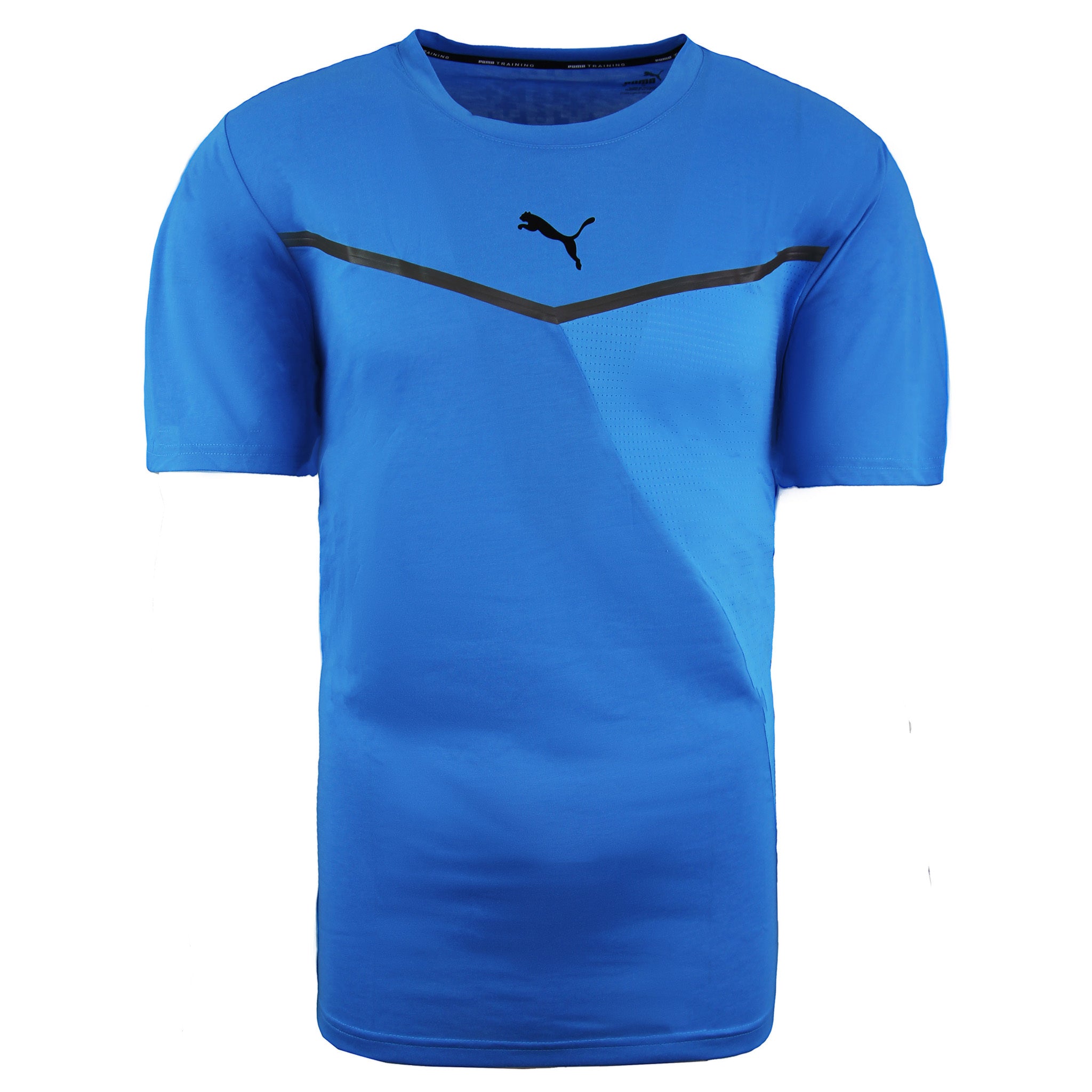 The Puma DryCell Thermo-R BND Running Short Sleeve Crew Neck Blue Men's Tee is designed to enhance your athletic performance while offering style and comfort. Made with Puma's DryCell technology, this tee efficiently wicks away moisture, keeping you dry and cool during intense physical activity. The shirt features a bold and dynamic blue design with a contrasting black Puma logo at the chest, adding a modern touch. A sleek chevron pattern runs across the upper chest, offering a distinctive, athletic look. The Thermo-R technology provides an added layer of warmth, making this tee perfect for cooler runs or training sessions. Its breathable fabric ensures flexibility and comfort, making it ideal for sports, workouts, or casual wear.