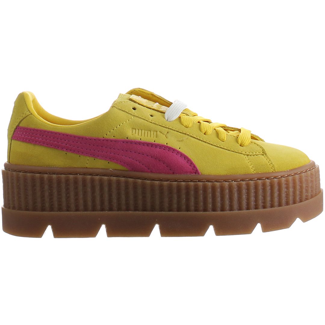 The Puma x Rihanna Fenty Cleated Creeper Women's Yellow Trainers are a bold and stylish footwear choice that stands out with their vibrant color and edgy design. Featuring a bright yellow suede upper, these sneakers are complemented by a striking pink Puma formstrip on the sides for a fun, eye-catching contrast. The signature elevated, cleated sole adds a unique touch, offering both a fashion-forward silhouette and enhanced grip. With cushioned comfort and a secure fit, these trainers combine high fashion with practicality, making them perfect for those who want to make a statement while staying comfortable.