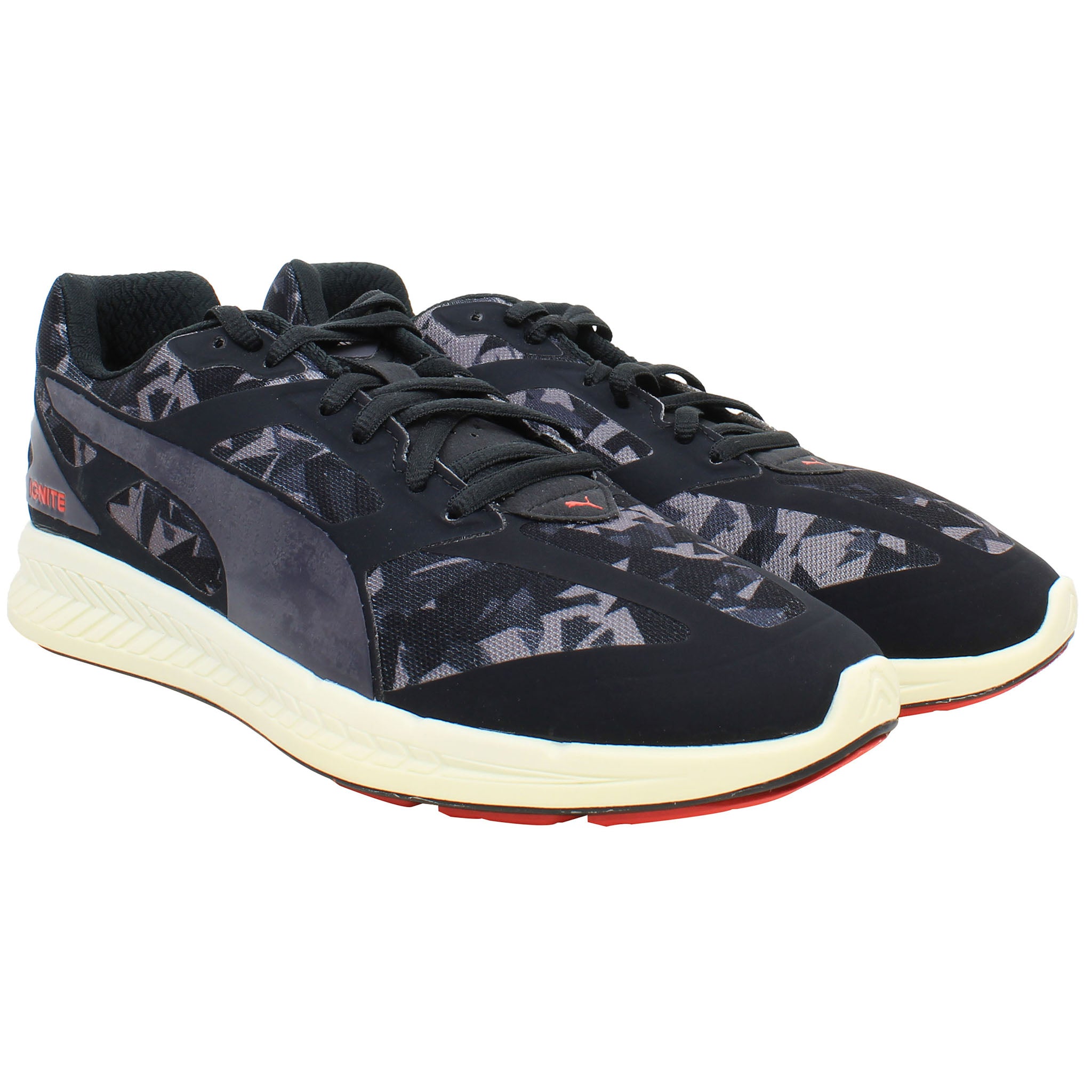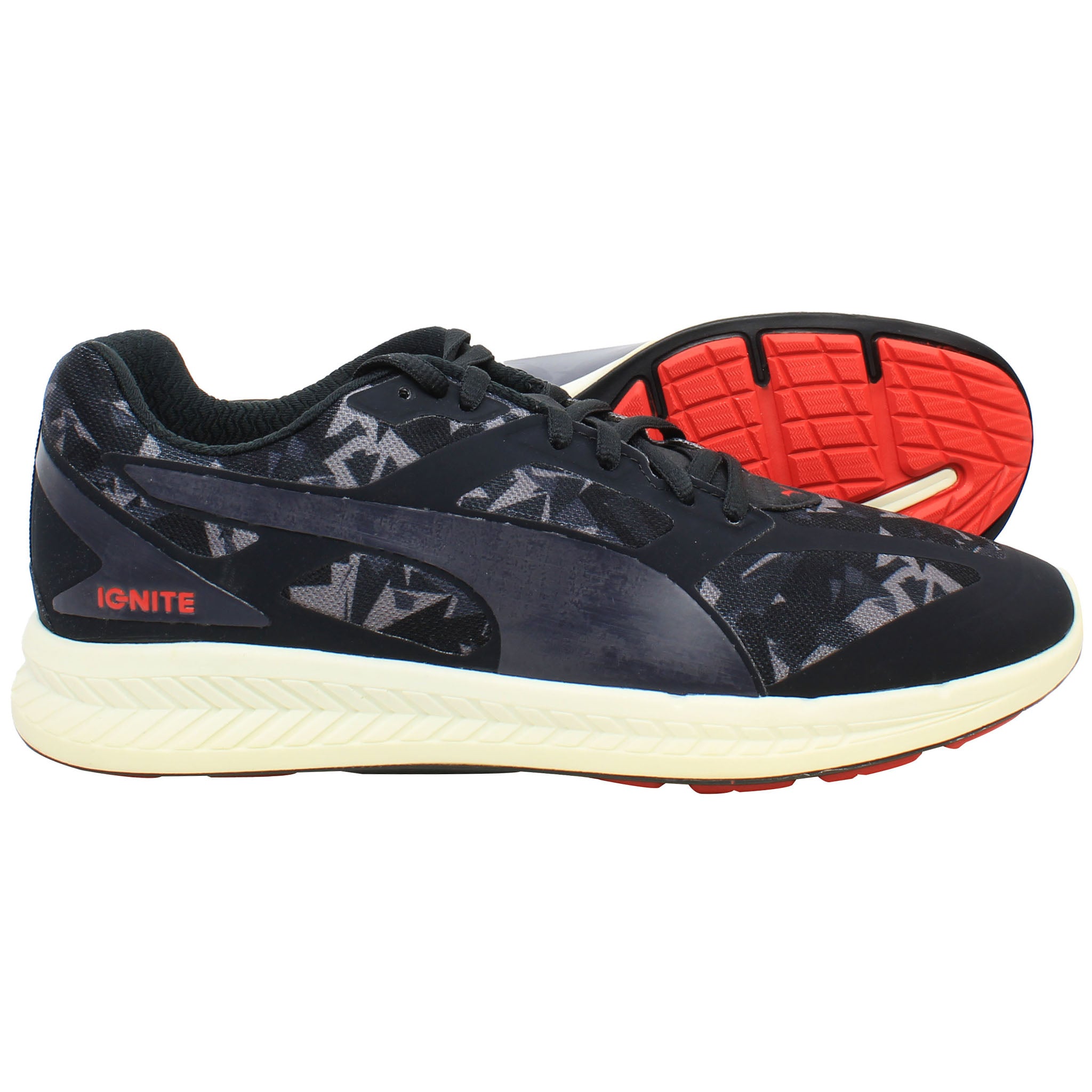 The Puma Ignite Fractured Men's Black Running Shoes offer a dynamic, high-performance design with a bold and modern look. Featuring a sleek black upper with a fractured geometric pattern, these shoes combine style with function. The lightweight mesh material provides breathability, keeping your feet cool during intense activities. Equipped with Puma's Ignite foam midsole, these trainers deliver excellent cushioning and energy return, ensuring comfort with every stride. The durable rubber outsole offers superior grip and traction, making them perfect for running or other athletic pursuits. The iconic Puma branding and striking red "Ignite" logo add a stylish finishing touch to the shoes. Whether you're hitting the track or looking for a sleek casual look, the Puma Ignite Fractured trainers are designed for both performance and style.