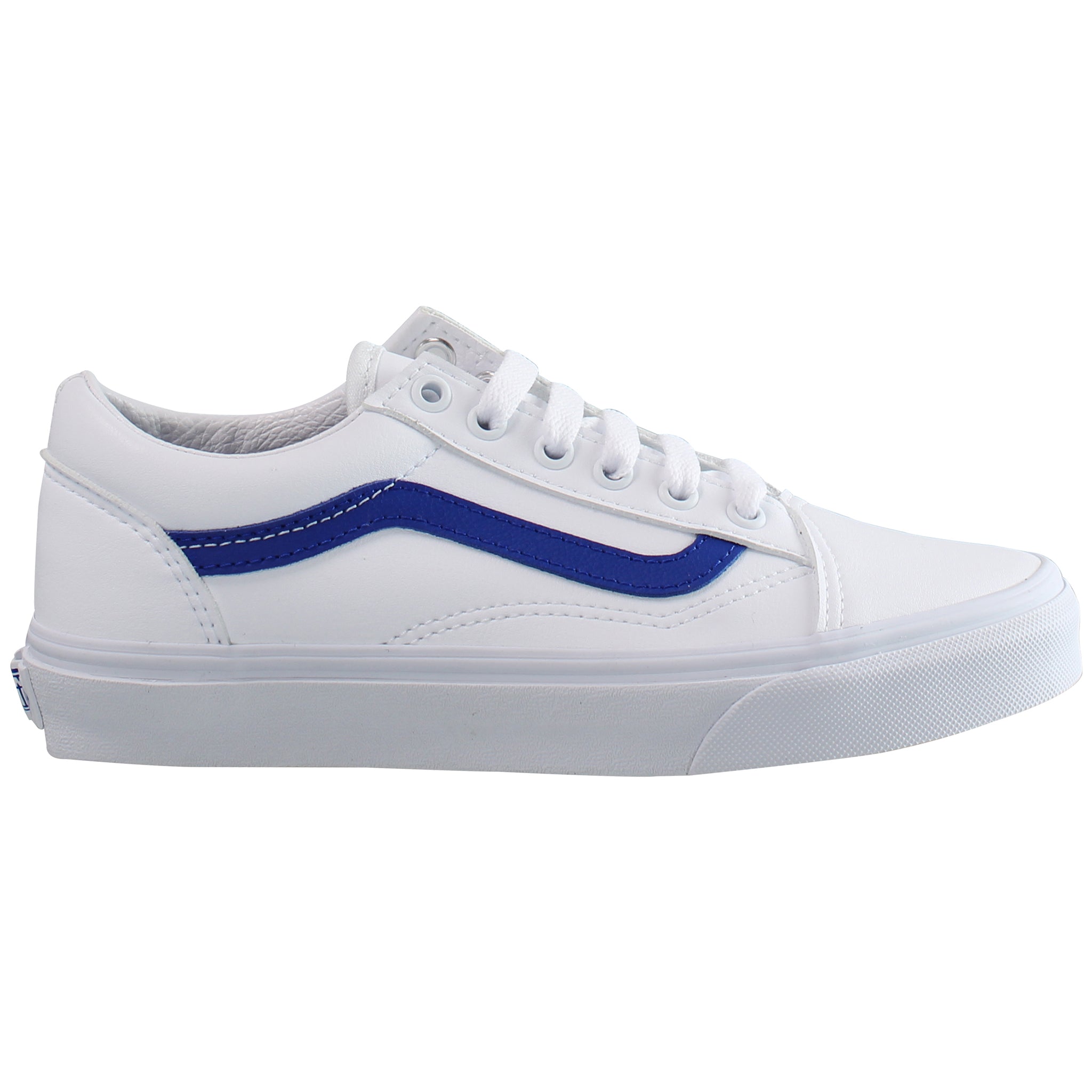 The Vans Old Skool Kids White Shoes offer a fresh, clean look with a modern twist, perfect for young trendsetters. Featuring an all-white leather upper, these low-top sneakers are both durable and easy to clean, making them ideal for everyday wear. The bold blue Vans side stripe adds a pop of color and contrast, giving the shoes a distinctive and stylish edge.