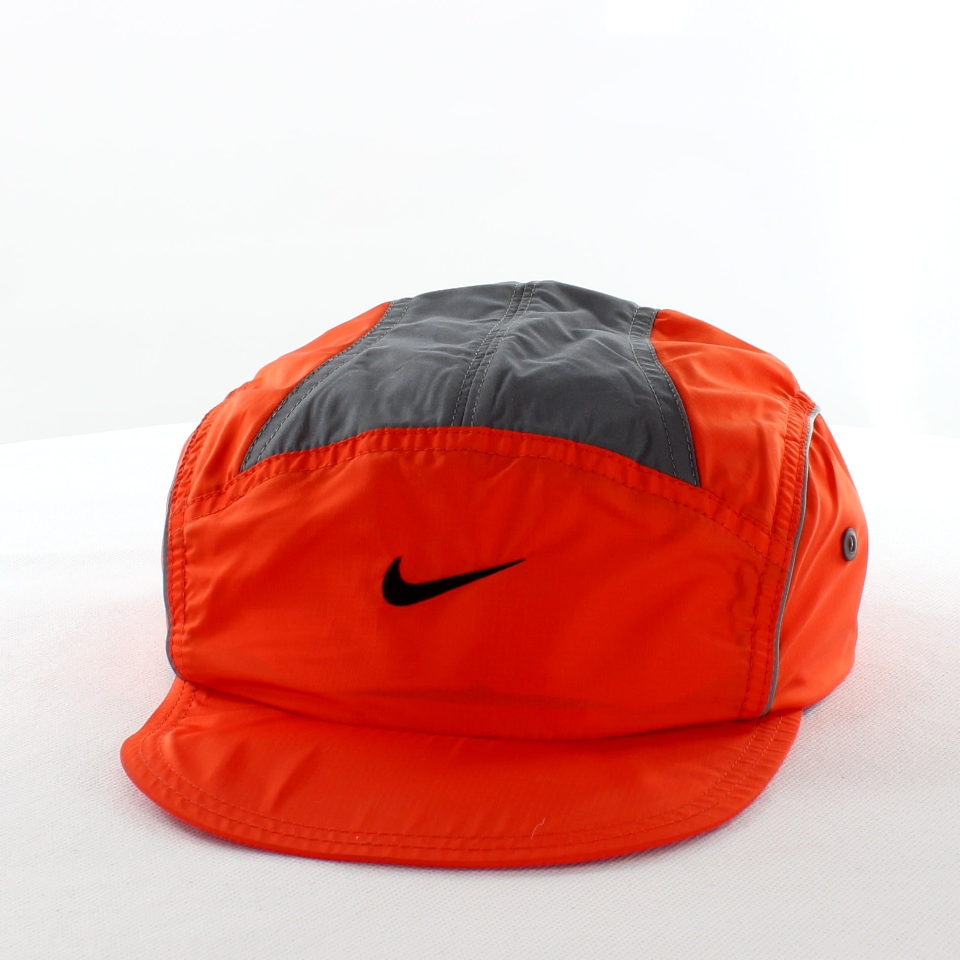 Elevate your athletic style with the Vintage Nike 2001 Clima-Fit Adults Orange Cap. This cap features a vibrant orange body complemented by a gray top panel, making it an eye-catching addition to any outfit. The signature Nike swoosh is prominently displayed in black on the front, showcasing the brand's iconic identity.